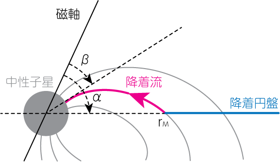 ここまで議論してきたように、強い磁場をもつ中性子星への降着はアルヴェーン半径で堰き止められ、磁力線に沿って磁極領域に流れていきます。