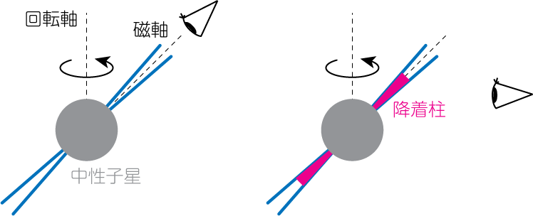これまで考えられてきたX線パルサーの描像は、中性子星の磁極方向に光のビームが出るというものです。 磁極を正面から覗き込めるときにのみ、中性子星からの光を観測することができます。 これは宇宙灯台のモデルと呼ばれ、これまで長らく考えられてきました。