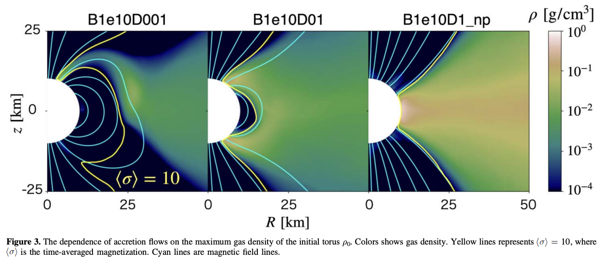 同じくシミュレーション研究ですが、Inoue et al. (2023)では一般相対論の効果も含めた磁気流体計算を実施しました。 しかも、先ほどは降着柱の部分のみを計算していましたが、こちらの研究では降着円盤部分も含めた中性子星表面への降着の様子を3次元シミュレーションし、降着率による降着柱と磁気圏の