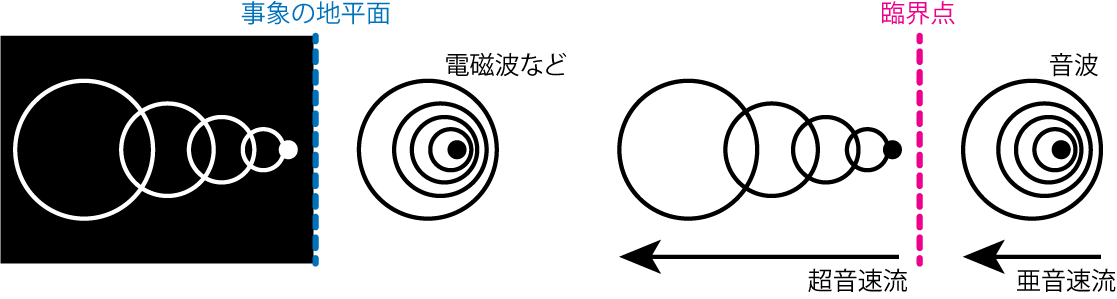 ブラックホールでは事象の地平面と呼ばれる場所が存在し、それより内側は光速で伝搬する波 (電磁波や重力波など)すら脱出することができません。 ラバール管により遷音速流を作ると、流れの上流では音波が普通に伝搬できます。 しかし、超音速流となっている下流側で発生した音波は、臨界点を超えて上流側に到達することは不可能となります。 このような理由から、臨界点を音波に対するブラックホール (sonic black hole)の事象の地平面とみなすことができることがわかります。