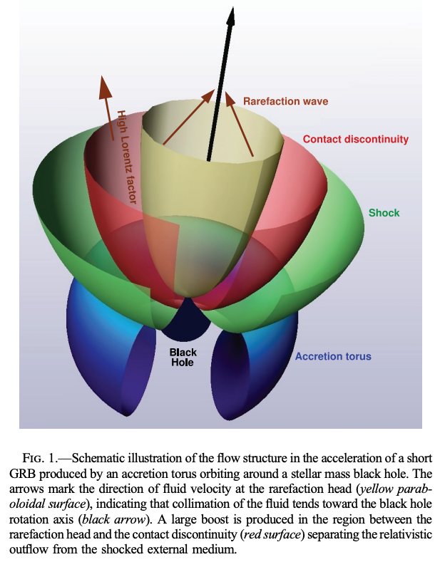 Aloy & Rezzolla (2006)より、ショートガンマ線バースト(short GRB)での流れの構造を示したもの。 中心に恒星質量ブラックホールが存在し、その周りに降着トーラスが存在する。 降着に伴ってジェットが発生すると、衝撃波(緑色)・接触不連続面(赤色)・希薄波(黄色)が生じる。